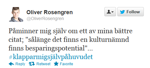 Den som scannar av nätet eller söker i moderata programtexter kan säkert hitta mycket mer. Det är kanske ingen tillfällighet att partiet hoppar på de estetiska programmen i stället för att fråga sig själva varför jobbpolitiken har misslyckats. Svenskt Näringsliv tjuvstartade politikerveckan i Almedalen förra året med krav på slopat studiestöd för esteter och konststuderande. Nyligen blev Oliver Rosengren "uppmärksammad" på Twitter för kommentaren ovan: "Så länge det finns en kulturnämnd finns besparingspotential".