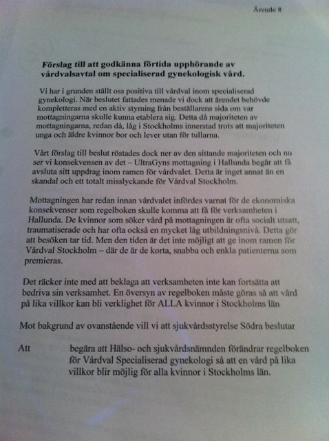 Så löd vårt socialdemokratiska förslag när Sjukvårdsstyrelse Söder igår behandlade ett ärende om "förtida upphörande av vårdvalsavtal om specialiserad gynekologisk vård". Så heter den lite mer formella rubriken.